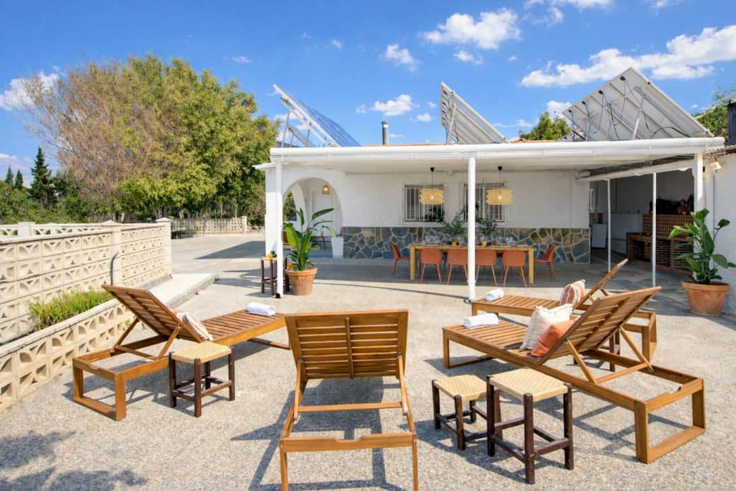 La casa dispone de una piscina exterior y una agradable zona con comedor al aire libre y cómodas tumbonas, perfecta para relajarse y disfrutar del buen tiempo.