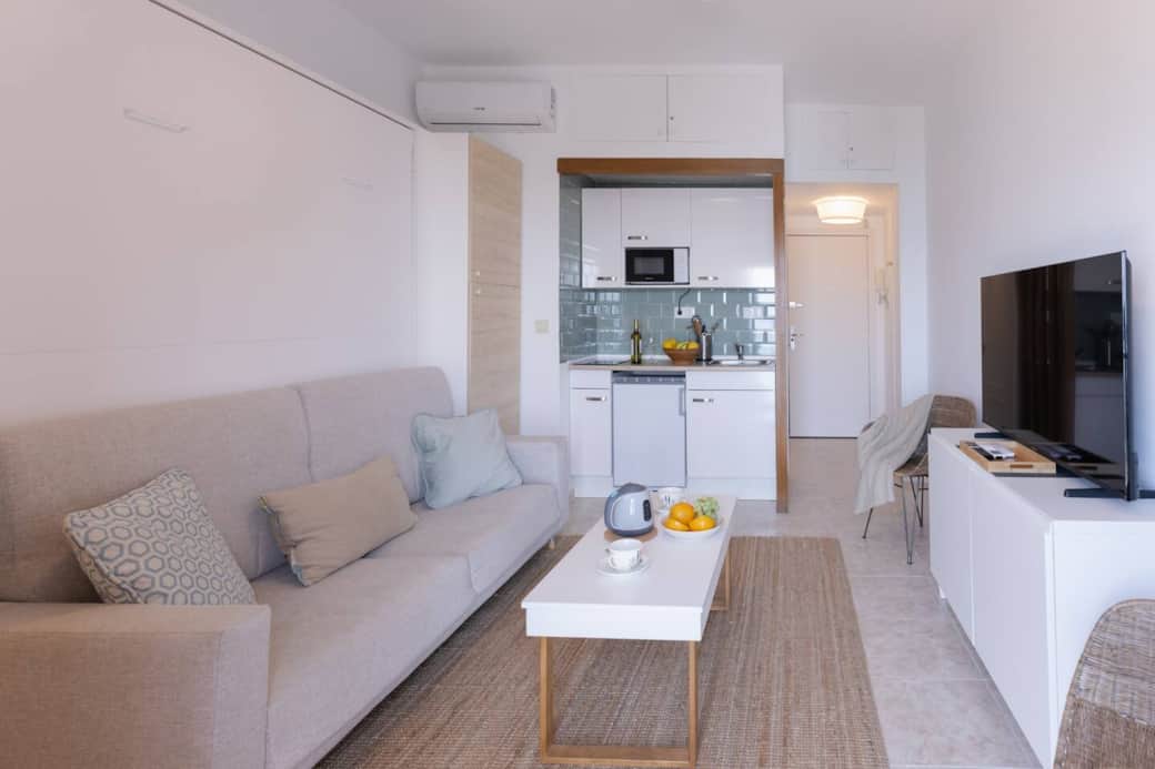 En la única habitación encontrarás muy bien distribuida, la cocina completa, armarios, sala de estar y una amplia cama muy fácil para disponer de ella y para guardar cuando no sea necesaria.